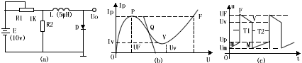 图三(a)为自激多谐振荡电路。静态工作点Q置于负阻区(见图3(b))。当接通电源后,电流I从零开始增至峰点电流,Ipo但由于静态点不稳点,加上电感不允许电流突变,所以电流增至Ip后,周而复始地进行,从而产生了快速的矩形脉冲[见图3(C)]。其参数如下: